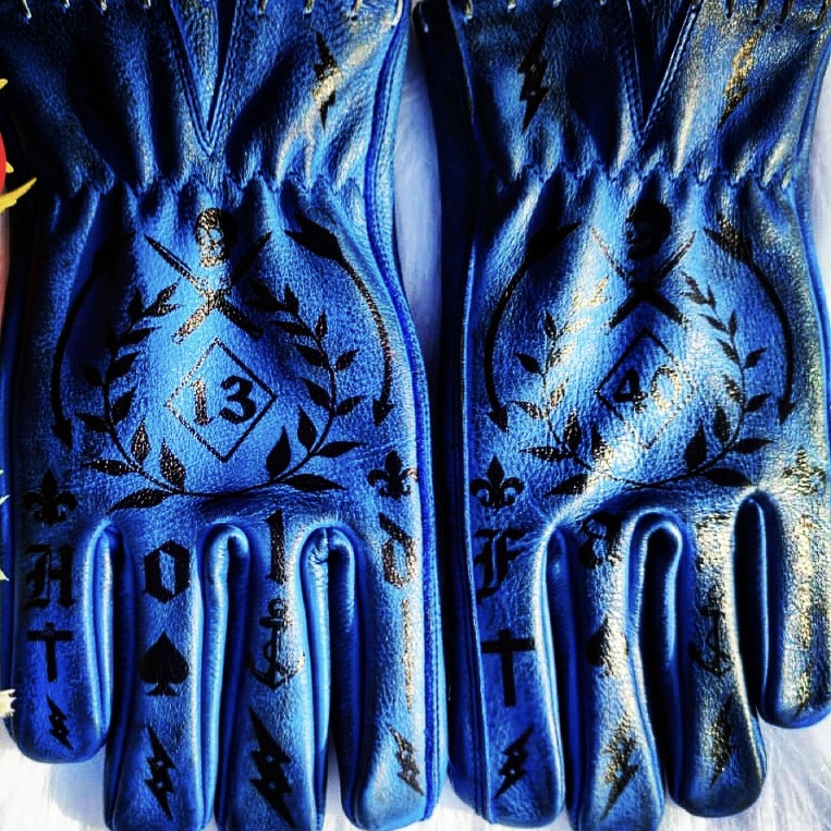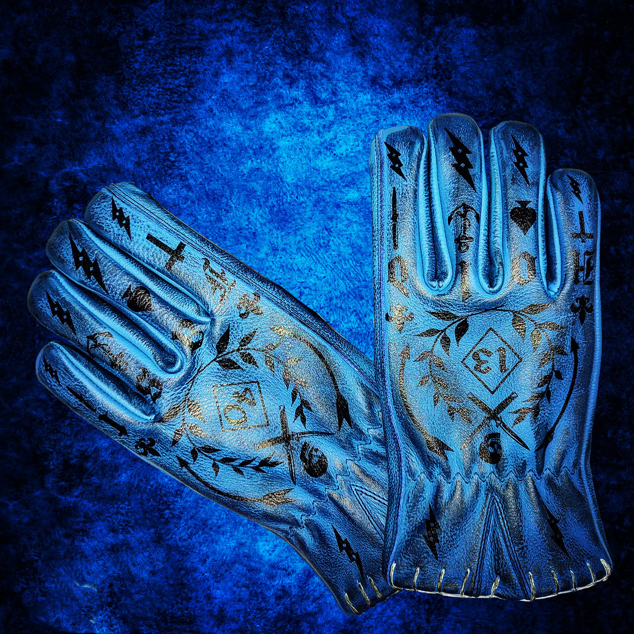 Tattoo art inspired electric blue genuine leather motorcycle riding gloves