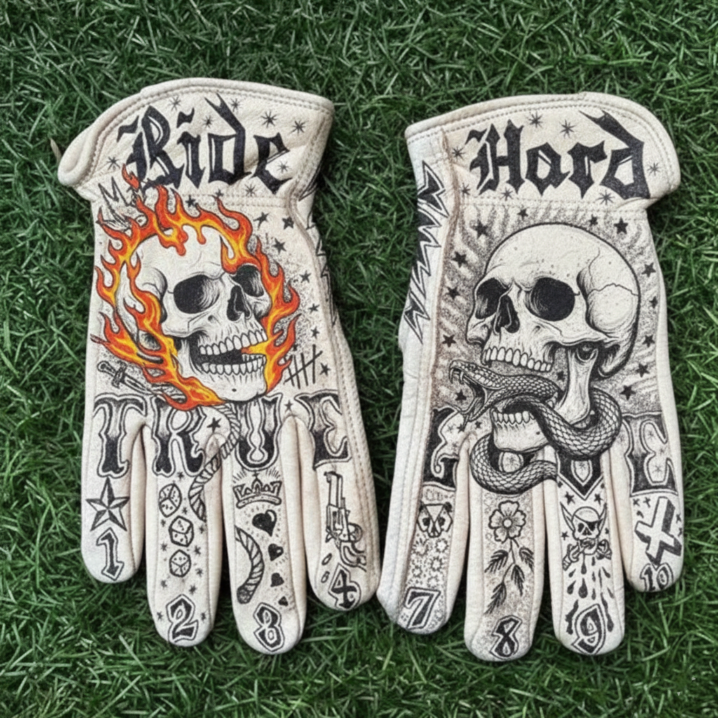 Outlaw Biker Style Flaming Skull Tattoo Print Leather Riding Gloves
