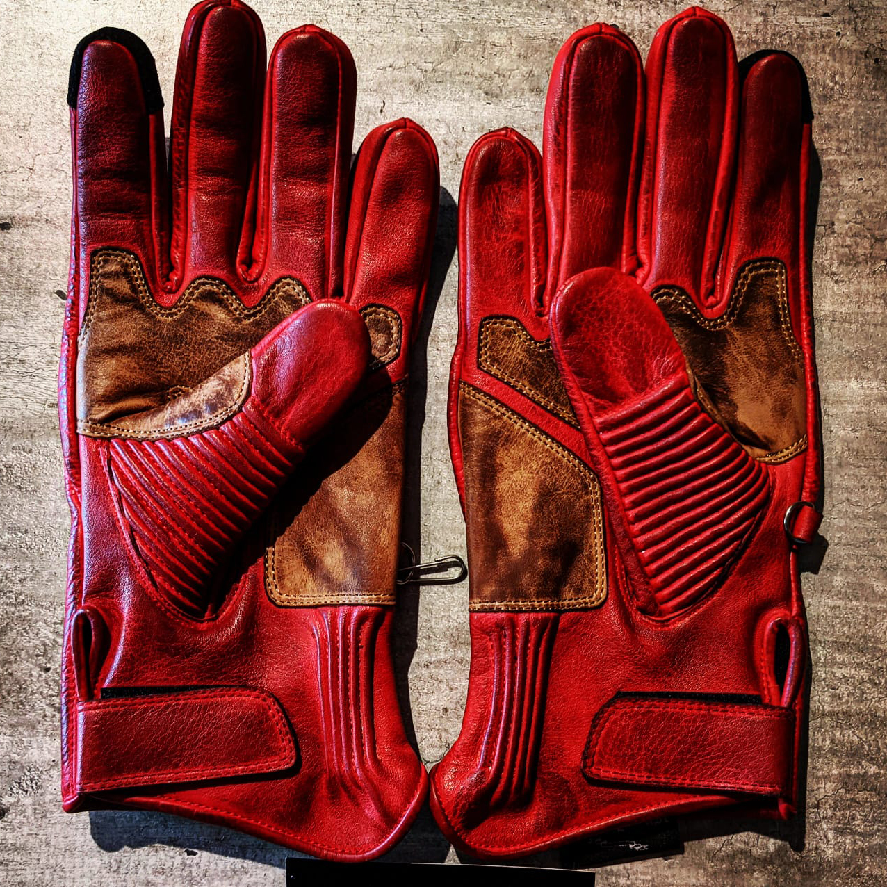 Rugged patina red leather vintage style protective motorcycle riding gloves