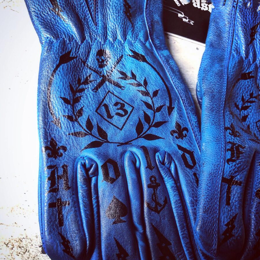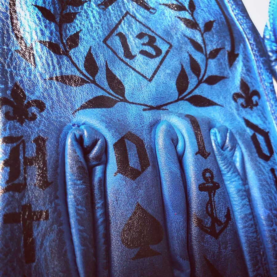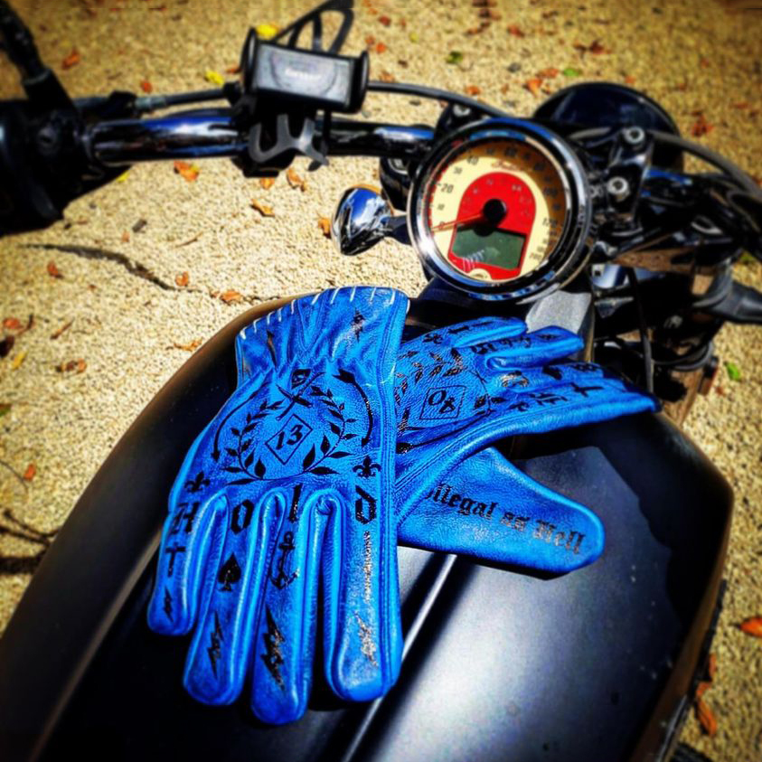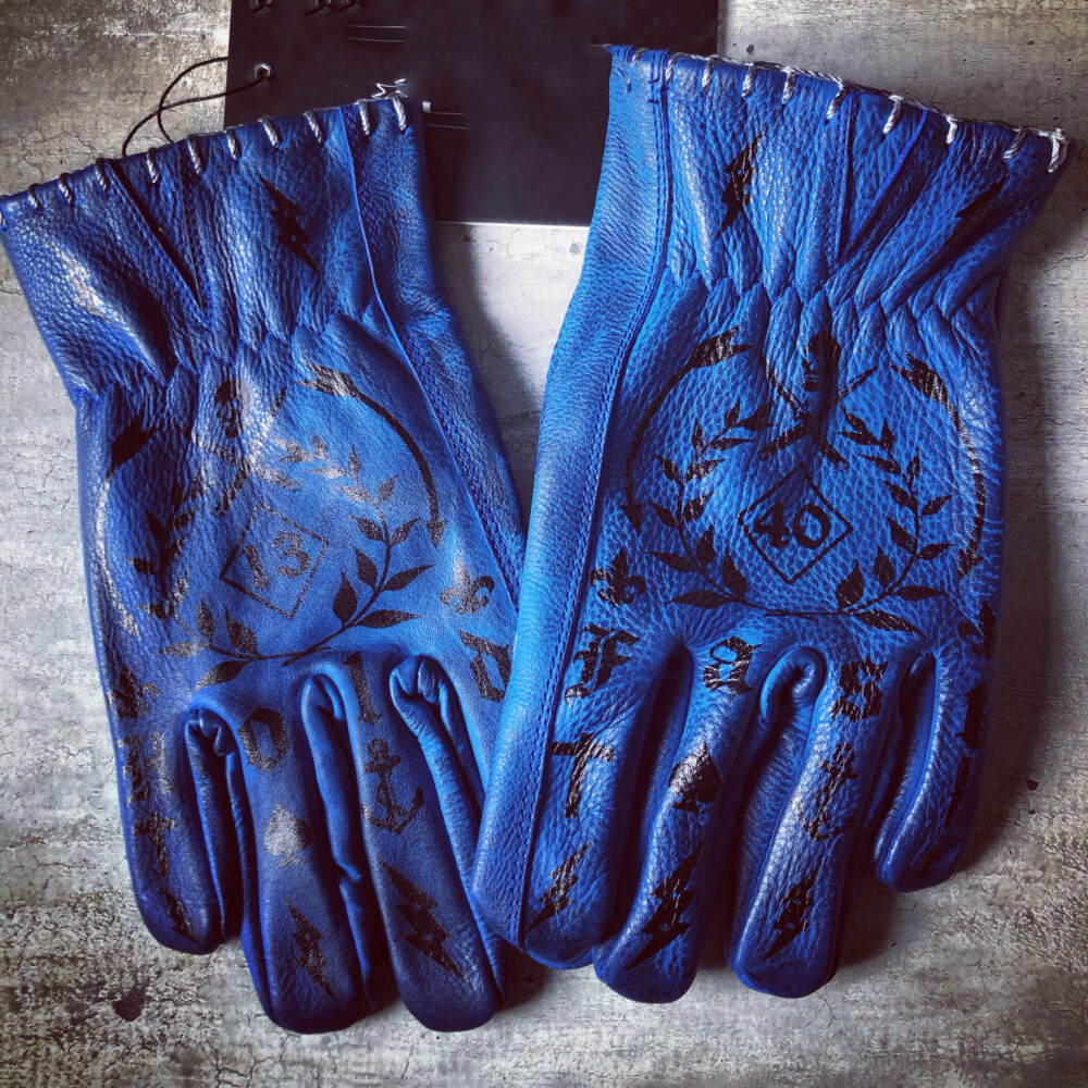 Tattoo art inspired electric blue genuine leather motorcycle riding gloves